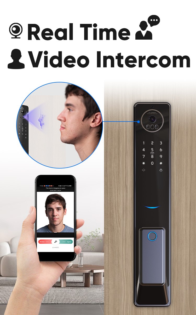2.Visual intercom with Peep hole: you can see who is in front of your doorremotely by phone or at home by screen on lock.