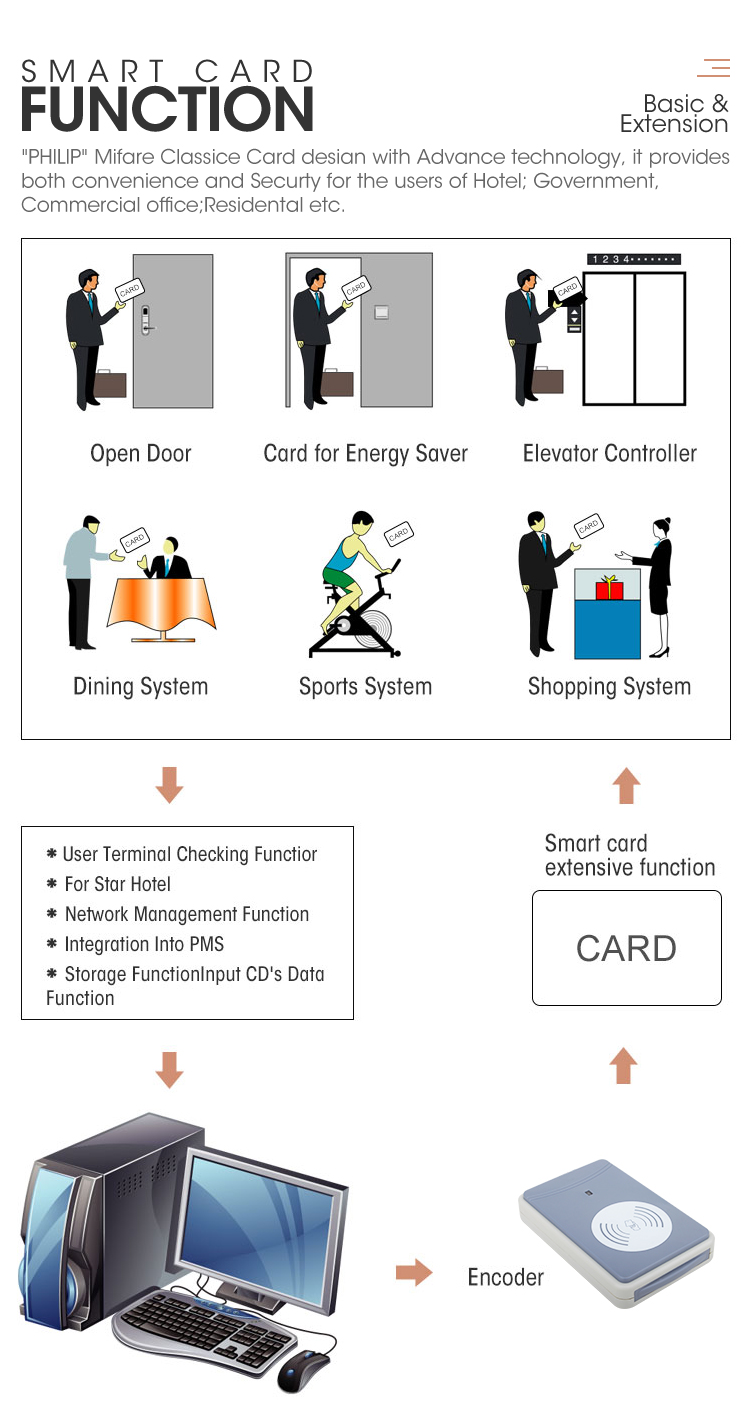 9. Hotel software interface with other PMS (API / SDK can be provided),Future proof re-programmable FL .ASH RAM lock memory.