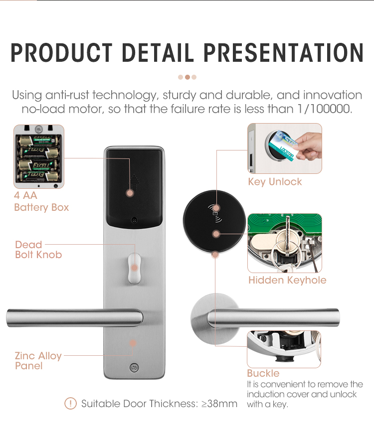 9. Management classification: support 14 types of cards including authorization card, clock card, room number setting card, master card, emergency card, floor card, building card, guest card, temporary card, house keeping card, alarm card, no-disturbing card etc